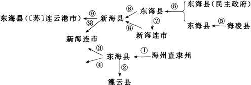 ①1912年称海州直隶州;同年改海州直隶州为东海县。②1912年4月析东海县东境置灌云县。③1939年2月日军侵占东海县,1940年11月,陇海铁路南建东海县民主政府。④1941年8月陇海铁路北建海凌县。⑤1941年海凌县更名为东海县。⑥1948年11月7日东海县全境解放,恢复原东海县建制。⑦1949年析东海县海州、新浦二镇与连云市,置新海连市。⑧1950年5月东海县与新海连市合并,称新海县。⑨1950年12月市、县分治,恢复东海县与新海连市。
