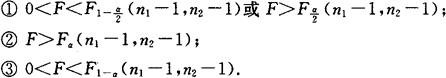 (3)给出α,H0的拒绝域为: ① ②F>Fα(n1,n2); ③0<F<F1-α(n1,n2). 2.μ1,μ2均未知 (1) H1:① ② ③ (2)统计量