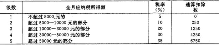 注:本表所称全月应纳税所得额是指以每月收入额减除费用800元后的余额或者减除附加减除费用后的余额。 对工资、薪金所得适用9级超额累进税率,是根据我国公民和在我国工作的外国个人的收入情况,参照其他国家的税率水平,本着略低于其他国家的精神设计的。税率从低是我国个人所得税的特点。在我国工作的外国个人的工资、薪金收入一般都比较高。但是由于外国个人的所属国家和工作类别不同,其收入水平也有很大差别。与外国个人的收入水平相比,中国公民的收入水平差距则更大。按照9级超额累进税率征税,个人月工资、薪金所得越多,适用税率也越高,其所缴纳的个人所得税款也就越多。充分体现了“对高收入者多征税,对中等收入者少征税,对低收入者免征税”的公平税负原则。同时,也能够适应我国公民和在华工作的外籍人员的收入水平。按规定扣除费用800元或者得扣除附加减除费用后,一般收入较高的中国公民和外国个人都应依法缴纳个人所得税。 个人所得税税率表最低一级税率为5%,与原个人收入调节税规定的20%最低税率相比,降低15个百分点,调幅是大的,这意味着实行新税法后中国公民的工资、薪金所得税负将大幅度降低;最高税率45%较原个人收入调节税的60%也降低了15个百分点,降幅也是很大的,外籍纳税人的税负只是高收入者略有提高,大部分纳税人的税负与原税法持平;总体税负为23%,与世界上多数国家和地区的个人所得税总体税负25%左右相比,我国个人所得税的总体税负属于适中偏低,这有利于吸引境外人才,符合进一步改革开放的要求。 2.5级超额累进税率。 个人所得税的5级超额累进税率适用于按年计算、分月预缴税款的个体工商户的生产、经营所得和企事业单位的承包经营、承租经营所得。该税率按个体经营者和对企事业单位的承包经营、承租经营的全年应纳税所得额划分最低一级为5%,最高一级为35%,共5级。具体税率如表3-4-2。 表3-4-2 个人所得税税率表 (个体工商户的生产、经营所得和对企事业单位的承包经营、承租经营所得适用) 1
