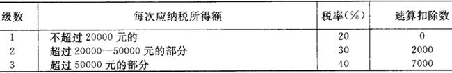 注:本表所称全年应纳税所得额是指以每一纳税年度的收入总额,减除成本、费用经及损失的余额。 对个体工商户和企事业单位的承包人、承租人的生产经营所得,实行5%至35%的分级超额累进税率,与原城乡个体工商户所得税相比,大大降低了税收负担。原《城乡个体工商业户所得税暂行条例》规定的税率为7-60%,对年所得额在5万元以上的,加征1-4成。按新税法的税率测算,税收负担率普降低,最高税收负担率降低了约20个百分点,使纳税人的税收负担趋于合理。 3.3级超额累进税率。 个人所得税法规定:对个人的稿酬所得,劳务报酬所得,特许权使用费所得,利息、股息、红利所得,财产租赁所得,财产转让所得,偶然所得和其他所得,按次计算征个人所得税,适用20%的比例税率。其中对稿酬所得适用20%的比例税率,并按应纳税额减征30%;对劳务报酬所得一次收入畸高、特高的除按20%税征外,还可以实行加成征收。对个人取得劳务报酬收入的应纳税所得额1次超过2万元至5万元的部分,按税法规定计算的税额,加征5成,超过5万元的部分,加征10成。与个人所得税法相比,每次应纳税所得额超过2万元至5万元的部分,税收负担增加50%,超过5万元的部分,税收负担又有50%的增加。这样规定的目的主要是增加对劳务报酬高收入的税收调节力度。参见表3-4-3。 表3-4-3 个人所得税税率表(劳务报酬所得适用)
