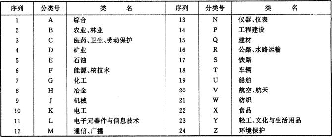 | 释义 | 中国标准文献分类法 《中国标准文献分类法》是由原国家标准局组织编制的,1984年7月颁布试行。经四年多试用后,1989年11月由国家技术监督局正式发布实施。这是一部标准文献专用分类法,适用于类分各级标准,其他有关标准化文献和资料亦可参照使用。分类法是针对民用标准和军民通用标准编制的,故未列军工类,因此,不适用于军工标准。(1) 1.分类体系结构。类目设置以专业划分为主,适当结合学科分类。分类体系原则上由二级组成:一级类目和二级类目。设24个大类(见表8.4-3)。 表8.4-3 《中国标准文献分类法》大类类目表