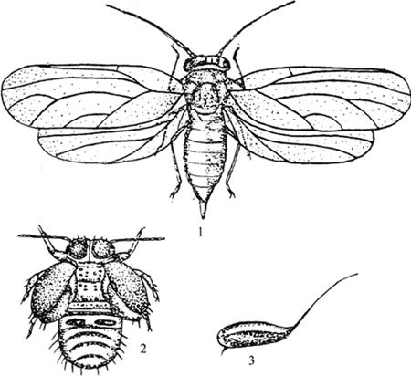 图2-11 梨木虱 1.雌成虫 2.若虫 3.卵 【发生规律】: 年发生世代因地区而异。辽宁3~4代,河北、山东4~6代。世代重叠。各地均以冬型成虫在树皮缝、落叶、杂草及土缝中越冬。每年发生4~5代地区,越冬代成虫在3月上旬梨树芽萌出时开始活动。对温度敏感,气温在0℃以上,天气晴朗则爬出,刺吸汁液,并交尾产卵。4月初为越冬代成虫产卵盛期,卵主要产在短果枝叶痕及芽基部折缝内,呈线状排列。4月下旬至5月初为第一代若虫盛发期,初孵若虫潜入芽鳞片内或群聚花簇基部及未展开的叶内为害。以后各代成虫多将卵产于叶柄、叶脉及叶缘齿间,每头雌虫可产卵290粒左右,卵期一般7~10天。若虫怕光,喜欢潜伏在暗处为害。生长季节若虫多在叶片反面、叶柄基部和芽基部吸食,且分泌大量淡黄色黏液,常将叶子粘合重叠,若虫潜伏其内群聚为害。各代成虫出现期,第一代5月上旬至6月中旬,第二代6月上旬至7月中旬,第三代7月上旬至8月下旬,第四代8月上旬开始发生,9月中下旬出现第五代成虫,全为越冬型。 【防治方法】: (1)人工防治 早春刮除老树皮,清理园内和周围的残枝、落叶及杂草,消灭越冬成虫。 (2)生物防治 保护利用天敌。中国梨木虱的天敌有:花蝽、草蛉、瓢虫、寄生蜂等,以寄生蜂控制作用最大,卵自然寄生率达50%以上,应避免在天敌发生盛期施用广谱性杀虫剂。 (3)药剂防治 防治时间:鸭梨花芽膨大期即为越冬代成虫出蛰的盛末期。药剂种类及浓度:生物制剂有0.6%苦参碱1000倍液和1.8%阿维菌素4000倍液;化学农药有20%双甲脒1200~1500倍液,该药不杀伤天敌,对梨木虱若虫杀伤力最强,对卵及成虫药效较差,25℃以上药效最好,或40%乐果乳剂1000~1200倍液,20%杀灭菊酯乳剂3000~4000倍液或20%来福灵乳剂4000倍液。 |