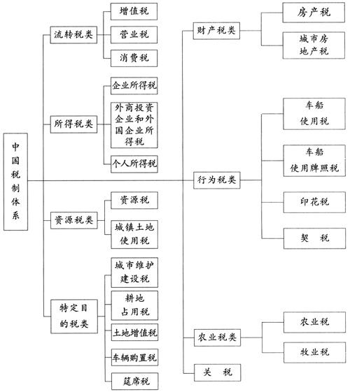 | 释义 | 中国现行税制体系 (1)我国现行的税制体系 我国现行税制体系是在原有税制的基础上,经过1994年工商税制改革逐渐完善形成的。现共有23个税种,按其性质和作用大致可分为七类: ①流转税类。包括增值税、消费税和营业税。主要在生产、流通或者服务业中发挥调节作用。 ②资源税类。包括资源税、城镇土地使用税。主要是对因开发和利用自然资源差异而形成的级差收入发挥调节作用。 ③所得税类。包括企业所得税、外商投资企业和外国企业所得税、个人所得税。主要是在国民收入形成后,对生产经营者的利益和个人的纯收入发挥调节作用。 ④特定目的税类。包括筵席税、城市维护建设税、土地增值税、车辆购置税、耕地占用税,主要是为了达到特定目的,对特定对象和特定行为发挥调节作用。 ⑤财产和行为税类。包括房产税、城市房地产税、车船使用税、车船使用牌照税、印花税、屠宰税、契税,主要是对某些财产和行为发挥调节作用。 ⑥农业税类。包括农业税、牧业税,主要是对取得农业或者牧业收入的企业、单位和个人征收。 ⑦关税。主要对进出我国国境的货物、物品征收。 上述税种中的关税由海关负责征收管理,农业税由财政局负责,其他税种由税务机关负责征收管理。 上述23种税,除《外商投资企业和外国企业所得税法》、《个人所得税法》、《农业税务例》是以国家法律的形式发布实施外,其他各税种都是经全国人民代表大会授权立法,由国务院以暂行条例的形式发布实施的。我国现行税制体系见图1-1: