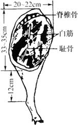 图21-10-1 猪腿的切割图 ②鲜腿的修整:金华火腿对外形要求很严格。刚验收的鲜腿粗糙,不呈“竹叶形”,因此,必须初步整形(俗称修割腿坯),再进入腌制工序。整形的目的除使火腿有完善的外观,还对腌后火腿的质量及加速食盐的渗透都有一定的作用。修整时要特别注意不损伤肌肉面,仅露出肌肉表面为限。 先用刀刮去皮面的残毛和污物,使皮面光洁,然后用削骨刀削平耻骨,修整坐骨,斩去脊骨,使肌肉外露,再将周围过多的脂肪及附着肌肉表面的碎肉割去,将鲜猪腿修整成“琵琶形”,腿面平整,如图2-10-2所示。在耻骨下面沿脊椎延长方向的肌肉内部有两条粗大的动脉血管,内积有淤血,而且该处又是大腿肌肉最厚的部位,同时此处肌肉内包有耻骨和大腿骨。因此,在修整时必须注意将血管中瘀血用大拇指挤出,防止腌制时腐败。