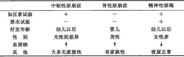 | 释义 | 中枢性尿崩症 【释义】: 中枢性尿崩症是因抗利尿激素(ADH)分泌不足或肾脏对ADH不反应所引起的以多饮多尿为主要表现的疾病。正常人ADH在深夜和早晨分泌增高,午后较低。本病按病因可分为原发性、继发性、遗传性三种,按发病部位可分为中枢性尿崩症及肾性尿崩症两大类。 1.中枢性尿崩症 多由于垂体后叶或下丘脑病变引起,分为原发性和继发性。原发性又包括特发性和遗传性两种。前者多由于视上核和室旁核神经细胞退行性变引起;后者多有家族史,较少见,可能为常染色体显性遗传,病情较轻。继发性者主要继发于颅内肿瘤,畸形、外伤、感染、手术等。 2.肾性尿崩症 为常染色体显性或性连锁显性遗传,它是先天性远端肾小管对ADH的敏感性下降所致。 【诊断】: 1.临床表现 有典型的烦渴多饮多尿症状,尿比重低下,尿糖阴性应当考虑本病。尿量每天每平方米体表面积超过3000ml,尿比重在1.006以下,肾功能正常者可进行必要的辅助检查,即能明确诊断。 2.辅助检查 (1)莫氏试验 24h尿量明显增多,多次尿比重均低于1.006者。 (2)禁水试验 用于鉴别尿崩症和精神性烦渴。如禁水后尿量明显减少,尿比重高达1.015以上或尿渗透压达300mmol/L以上者,则排除尿崩症,为精神性烦渴。反之如尿量无明显减少,尿比重达不到1.015以上者,甚至有体重下降,或血压下降者则为尿崩症。 (3)加压素试验 用于鉴别中枢性尿崩和肾性尿崩。用水溶性加压素0.1u/kg肌注,注后30~60min若尿量明显减少,比重达1.015以上,尿渗透压300mmol/L者,可诊断为中枢性尿崩症。 (4)其他检查 为查清尿崩的病因学,可作头颅X线摄片、CT或MRI检查。同时应排除糖尿病、肾小管酸中毒、药物因素(利尿药)引起的多饮多尿。 3.鉴别诊断 见表13-2。 表13-2 中枢性尿崩症的鉴别诊断