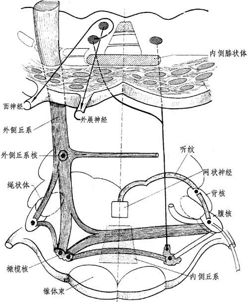图11-12 耳蜗中枢束(径):脑桥、丘脑及丘脑皮质段