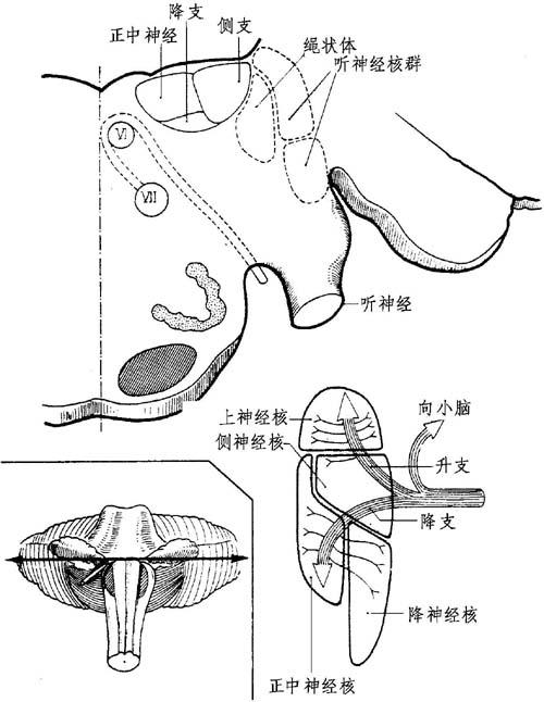 图11-11 耳蜗中枢束(径)(桥脑内段) 在耳蜗神经干交叉越过前庭神经纤维后分成内前和上二支,耳蜗纤维(脑桥神经元)至延髓-脑桥灰质。继续讨论关于耳蜗核群、耳蜗腹束、耳蜗背束、反射束。 1 .耳蜗核群属于两组 (1)腹核:呈顶在下方的锥体形,位于延髓和脑桥之间,在下小脑脚或绳状体上方的前外侧面后方和背核下方之间散开。在此腹核除外侧前庭核的两束纤维外(Hardy纤维来自球状囊并借入耳蜗神经),接受全部第八对脑神经的耳蜗神经纤维。自其上部发出耳蜗腹束或感觉束。 (2)背核:卵圆形,位于腹核的后方。在下小脑脚下方散开以达到第四脑室底外侧隐窝的后方。位于听结节凸起。仅接受来自腹核的纤维。 这些核群为双极细胞体。 2.耳蜗腹束或主要途径 此为到皮质的感觉束。为叙述方便,可分四部认识: (1)内延髓-脑桥部:此部集中在脑桥橄榄体处,取名为斜方体,其纤维在此与内侧丘系交叉,可分为(据C.Eyries):①同侧纤维,其一部丘系进入橄榄体,在此形成中转站;另一部直接升入外侧丘系。对侧纤维,多出2.5倍。此部大部分纤维中转于橄榄体。一小部分纤维直接进入对侧外侧丘系。②橄榄体间的纤维连接两橄榄体。 接近腹核,主要耳蜗束交叉及继续的前庭束,于此向后者发出一纤维束(Oort)。此束来自耳蜗并获得前庭神经的纤维。 (2)桥脑-丘脑部:组成外侧丘系。其由以前的同侧和对侧外侧耳蜗纤维组成。这些纤维进入内侧膝状体。 起源:起自延髓-脑桥区,在橄榄顶。①直接在小脑束的内方;②在内侧丘系的外方;③在脑神经核前方;④在脑桥神经核后方。 行程:上升斜向前外方,横过脑桥和脚的帽顶,由外侧之内侧丘系散开,同对侧外侧丘系交换纤维。 在脑桥区域内,位于:上小脑脚前方,斜向上内方到红核,由交叉小脑束将其分开。在黑质的后方,借运动束与所在的小脑脚相邻:在内侧丘系的外方。自行连结成一短路;在脚的外内侧是Reil三角区,界邻:①上边的下丘体臂;②前边的小脑脚外侧沟;③后方的上小脑脚隆起。横断面呈顶在外的三角形。 终止:内、外侧丘系相互分开,互相变成直角而止于下丘部;大部分纤维在下丘臂里随行到内侧膝状体。 内侧膝状体下叶的灰核群含有丘脑-皮质束的细胞体或第3神经元。 (3)丘脑-皮质束:形成听放射;横行穿过丘脑下部,在视放射前方获得内囊带状核下的部分止于颞叶皮质。 (4)听皮质区:此区投影在颞叶第一回的上部分、中脑沟的下缘(Heschl横颞灰质,Brodmann 41区)。 听识别区位于颞叶第一回的前区2/3(22区)。 24区是否邻接下后方之14区,尚有争议。这也影响到识别力。 每个耳蜗的皮质投影区都是优势交叉两侧性的。可确定对各种不同声音的相应皮质区(皮质耳蜗);高音与颞横回的内部相对应,低音与外部相对应。 每个耳蜗所产生的纤维均通向两侧皮质区,一侧听区破坏不会导致明显的耳聋。只有当两侧听区破坏时,才会引起全聋。 3 .耳蜗背束:这是一条直接连接耳蜗系统和网状结构的延髓途径,此“唤醒途径”阻碍腹感觉束。它似乎在立体音听觉中起着很重要的作用。 背核产生的纤维混入前边的下小脑脚和后方之第四脑室底之间以形成听纹(髓纹),然后纤维进入缝内以便加入网状结构。此束严格地保持着一侧性。 4.反射束:此束主要司听觉出发点的反射,可能司耳蜗相互作用反射。此束有3组中枢,在3个不同地方。 (1)上橄榄体:由脑桥橄榄、副橄榄、前橄榄核、斜方体核组成,位于延髓-脑桥区。 其传入纤维来自同侧及对侧的耳蜗腹核;传出纤维分布到脑干及其各传导束路。 脑干中有①面神经的两个核,说明镫骨肌反射是两侧性的;②下达脊髓的前角(借后侧纵束);③延髓-桥、眼-脑灰质核;④网状结构中;⑤脑神经植物核中;⑥对侧橄榄体中。 除脑干外,在耳蜗:神经纤维束直接传出耳蜗-橄榄束和Pasmussen交叉束。 (2)丘系核:连接桥脑脚的丘系。其传入纤维来自外侧丘系,传出纤维分布到同侧内侧膝状体的上部和对侧下丘系。 (3)下丘系核群:由主要核、中枢核及其接受外丘系的大量纤维和内-背核组成。其传入纤维来自同侧外丘系和对侧丘系和对侧丘系核,其传出纤维分布到:①对侧下丘:听神经间的Gudden连合。②上丘(听-视束)。③脑神经核及髓质中:桥脑-皮质束、盖-延髓束以及盖-脊髓束。 同侧中脑,特别是肌张力反射的源泉。 二、前庭束及前庭中枢(图11-12,11-13)