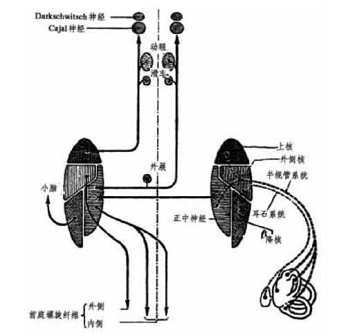 图11-15 前庭神经束的总观 前庭双极神经元与感觉性传入纤维存在多发性连接,而且动眼神经可参加控制和调节躯干、颈、四肢以及眼部反射运动的平衡。 1 .脊髓的连接:这里要借止于脊髓前角中之两股纤维束来实现。可控制躯干、四肢以及颈部的肌肉。 (1)前庭-脊髓侧束:侧前庭核生自唯一的同侧纤维,重新发出到脊髓各段;其对伸肌有兴奋作用,而对屈肌则有抑制作用。 (2)束内前庭-脊髓束:来自内前庭核,两侧分布;特别行向颈部脊髓和胸部脊髓高处以供背部和肌肉的运动神经元。 2.小脑连接:这里包括传入和传出途径,与小脑弓(绒球-结节叶)有重要关系。 (1)前庭-小脑连接:有两种: 直接的:由前庭升支产生的纤维组成。后者接受小脑下脚并加入盖核。 间接的:此等纤维在其到达盖核前连接降前庭核群。 (2)小脑-前庭连接:产生于小脑弓皮质并加入前庭核群,借2条途径:①同侧的直接途径;②间接途径,重新连接盖核之后并加入两侧的前庭核。 在小脑和前庭核之间有一条本体及定向非常准确的密切连接小脑和前庭核的双重通道。 3 .与动眼核群的连接:内侧纵束(后纵束)保证其直接连接。其组成一很广泛的联合束,自上方的后白连合到下方的颈髓。 前庭核与动眼核的连接是直接由前庭-中脑束(内侧纵束)来保障和交叉的。分布到:①动眼核群;②位于两脑邻近的Darkschwitsch和Cajal束连接。 系统化: 上前庭核(前庭神经上核)仅分布到同侧动眼神经核且主要管理垂直和旋转功能。 正中核(前庭神经内侧核),为两侧性的,对称分布,管理水平运动。 降前庭核(前庭神经脊核)和侧前庭核(前庭神经外侧核),仅起微小的动眼作用,间接连接属多发神经元的连接。此连接避开内侧纵束并有小脑和网状结构连接。 4.与网状结构的连接:直接借网状结构连接侧前庭核而可影响中枢核的结构。 此网状结构在眼球震颤中起重要作用。 另外,网状结构保证着同交感核、迷核、孤立束核的连接,以阐明出现眩晕的植物神经症状。 5 .与脑皮质的联合:前庭皮质束的存在似难争辩,然而其后的途径尚不十分清楚。此前庭-皮质束只接受同一途径的中枢耳蜗束途径;还有一途径到后侧纵束和视丘。 投影在本体冲动的相等集中点内。 注意:必须阻止耳蜗途径的功能,因它可把声的印象传到大脑皮质,而在前庭途径显然是在皮质下区。 应把前庭系统看成是本体感受器的不同成分之一。 中枢耳蜗束,仅代表极其复杂结构的一个图案,在某些动物身上比人的了解更清楚些。中枢及其多发性神经元并非是简单地反射传达器,而是转变反射。不存在皮质“发射装置”,声音的感受是多发兴奋冲动到达的结果。 与其他感官不同,前庭与丘脑接触极少。 |