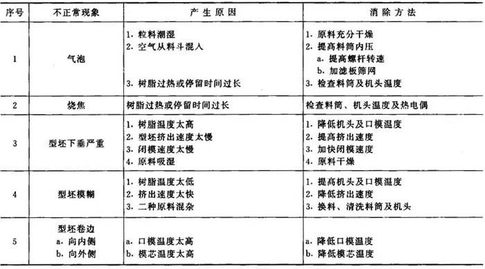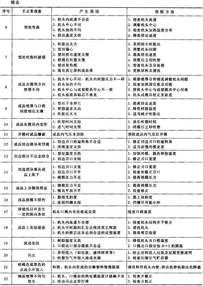| 释义 | 中空吹塑生产过程中不正常现象产生原因及消除方法 在吹塑成型过程中,由于原料、工艺、模具、管理等方面存在问题,制品往往会出现一些缺点和弊病,如不及时解决,将对生产带来很大影响,必须引起重视和及时采取措施。现将生产中常碰到的不正常现象、原因及消除方法列于表15-2,供参考。 表15-2 吹塑中空制品成型时的不正常现象、原因及消除方法