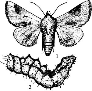 【形态特征】 成虫体长17毫米,翅展37~42毫米。头、前中胸部红褐色,后胸褐色。腹部黄白色。前翅紫褐色,有大的金色近三角形斑。老熟幼虫长40毫米。头部小,胴部黄绿色。腹部第五至八节较粗,逐渐向前方缩小。步曲行走(图6-14)。