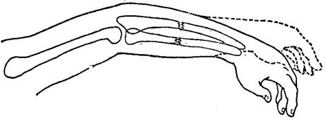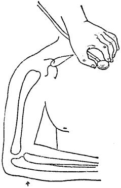 图2~1 尺桡骨骨折后前臂假关节活动 (四)触脉:四肢骨折病人要常规触摸桡动脉和足背动脉,特别肱骨髁上和膝关节部损伤,应列为常规,如触不到脉搏,则说明有血管损伤之可能。 四、听诊: (一)骨擦音:骨擦音是由两骨折断端移动时发生摩擦而产生的音响,也能用手触得这种感觉,是为骨擦感,它是诊断骨折的可靠体征。检查时,医者可用两手分别握远近骨折段,作侧向活动,即可产生骨擦音或骨擦感,但这样可增加局部损伤和病人痛苦,因此,这种检查法只允许在诊断不明确的时候,作为补充的检查方法之一,当骨折诊断已很明确,如局部已有明显畸型或经X线证实时,则不应作骨擦音或骨擦感的常规检查。 (二)骨传导音:当骨骼正常时,在骨骼之一端隆起处进行叩击,同时用听诊器在另一端可听到叩击音,这种声音是沿骨骼传导的,如某处骨骼的连续性中断,则其传导的音量及速度皆会发生改变。根据这种特点进行检查,亦可判断有无骨折存在。如检查上肢时,可将听诊器放在胸骨柄上,在桡骨茎突或肱骨内上髁处进行叩击(图2~2);下肢骨折,听诊器可放在耻骨联合的上方,在股骨内、外髁或胫骨内踝进行叩击,并做两侧对照检查,骨折侧传导音调比健侧低、速度慢。