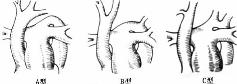 | 释义 | 主动脉弓中断 主动脉弓中断是指主动脉弓的两段管腔在解剖上完全离断。当相距较远的两段主动脉弓之间仅以纤维条索相连时,应被认为是主动脉弓中断而非主动脉弓缩窄。 (一)分型 主动脉弓中断按其发生部位可分为三型(图4-2)。