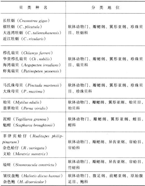 目前,我国进行人工增养殖的海洋贝类有近40种,其中养殖规模大、经济效益显着的有20多种,主要是瓣鳃纲(双壳类)的种类和腹足纲的鲍类,其分类地位如表所示(表4-1)。