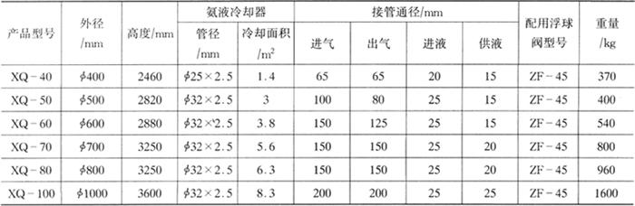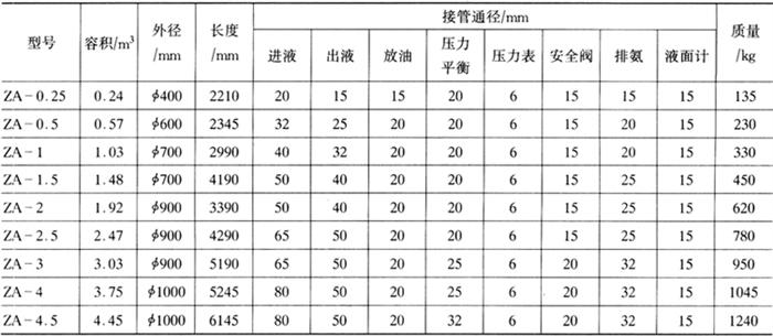 5.贮氨器的配置 (1)高压贮氨器的选配 高压贮氨器用来贮存由冷凝器来的高压液体,以适应压缩机工况变动时制冷剂流量变化,并减少每年向制冷系统补充制冷剂的次数。 高压贮氨器氨液贮存量按制冷能力确定,一般由下列经验推算:当采用墙排管及顶排管蒸发器时,每4200kJ/h取容量7h;当采用冷风机或冷水箱时,每4200kJ/h取容量5h。 贮氨器允许贮存的最大氨液容量不得超过其有效容积的80%。常用贮氨器规格见表4-4-31。 表4-4-31ZA型贮氨器规格