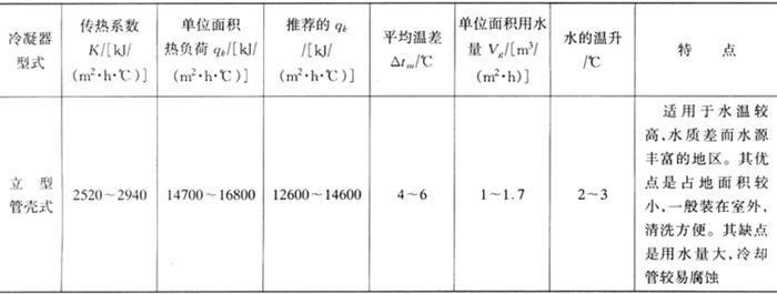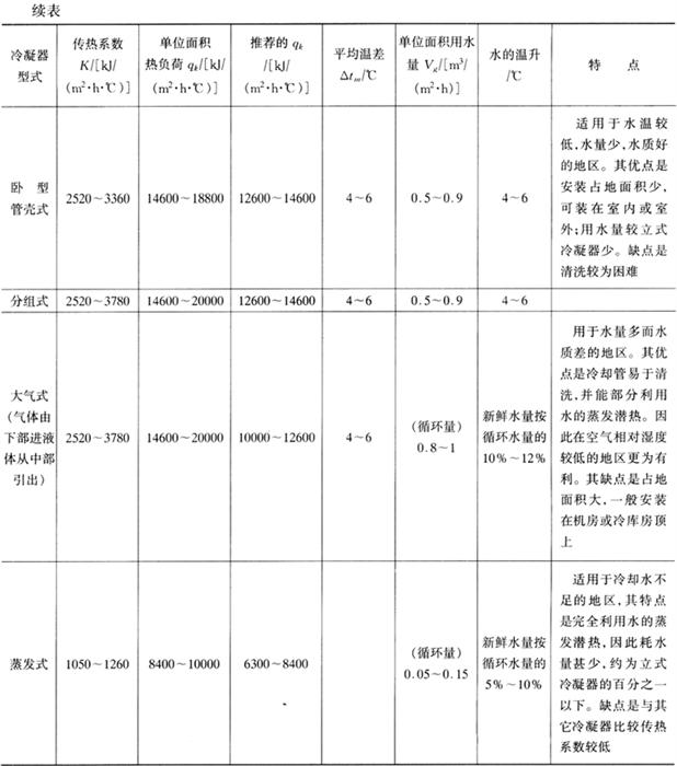 (三)冷凝器的选配 冷凝器的作用是将压缩机排出的高温、过热蒸汽冷却成为液态制冷剂。 1.冷凝器的类型及选择 冷凝器按冷却方式分为水冷式、内冷式和蒸发式、淋水式三大类。冷凝器的选择取决于水温、水质、水量、气候条件以及制冷剂种类和机房的布置要求等多方面因素。各种类型冷凝器的特点及主要技术参数见表4-4-28。 表4-4-28 各类冷凝器的K、qk和单位面积用水量Vg