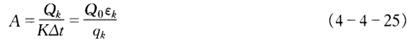 式中 A——冷凝器冷凝面积,m2 K——冷凝器传热系数,kJ/(m2·h·℃),按表4-4-28取值 △t——冷凝器中制冷剂与冷却水之间的对数平均温度差,℃ qk——冷凝器单位面积热负荷,kJ/(m2·h),按表4-4-28取值 Q0——制冷压缩机制冷量,kJ/h Qk——冷凝器热负荷,kJ/h εk——制冷压缩机冷凝负荷系数,由图4-4-18查得