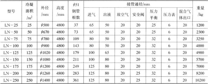 式中 t进——冷却水进水温度,℃ t出——冷却水出水温度,℃ cw——水的比热容,kJ/(kg·℃),cw=4.2kJ/(kg·℃) 4.常用立式、卧式冷凝器规格(表4-4-29、表4-4-30) 表4-4-29LN型立式冷凝器规格(上海第一冷冻机厂)