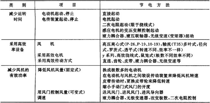 4.风机和节能 风机按结构形式可分为离心式、轴流式、往复式、回转式等几类;按其输出压力,小于1.5米水柱的叫通风机,大于1.5米水柱而小于2公斤/厘米2的叫鼓风机,2公斤/厘米2以上的叫压缩机。所谓风机,就是指通风机与鼓风机。目前国内用量最大的是离心式通风机,因为它具有效率高、流量大、输出流量均匀、结构简单、操作方便和噪音小等优点。离心通风机按产生压力的大小又分为低压风机(全压值≤100毫米水柱)、中压风机(全压值大于100小于300毫米水柱)和高压风机(全压值大于300小于1500毫米水柱)三种。 风机的品种很多,一般是根据系统所输送的介质及其它条件来选择恰当的结构型式。例如,输送各种气体或气体介质含有微量细颗粒杂物时,可选用效率高的离心叶轮的鼓风机或引风机(如采用机翼型叶轮,虽效率更高,但电耗亦增大);输送含有坚硬材料尘粒的各种气体、谷物、碎木片、锯末等,可选用放射性叶片的离心式风机(叶轮材料可有特殊要求);输送长纤维(如刨花、破布等),可选用没有前盘的叶轮改型风机;输送条件更恶劣的纤维材料时,可选用斧式固定叶轮的轴流风机(有时起到割断青贮饲料的作用)。此外,还要根据通风系统所匹配的载荷性质来选择风机,并且要合理布置通风系统。风机的节电方法见表2.2.3-2。 表2.2.3-2 风机的节电方法