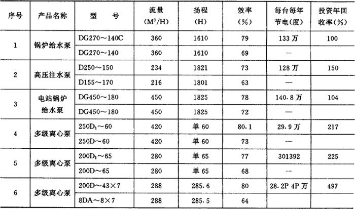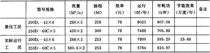 从表中可以看出,按给定的条件,选用200D1-43×6的三台泵比选用250D-60c×5的两台泵每年可节电15.68万度。如果选用250D-60c×4型,则其性能曲线下降,使效率降至74%,每年耗电比200D1~43×6泵多32.18万度,比5级的耗电也多得多。所以,选择泵时,要对节电投资、节电效果、运行维护费用等进行综合分析。 |