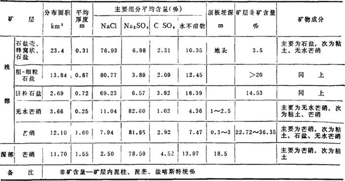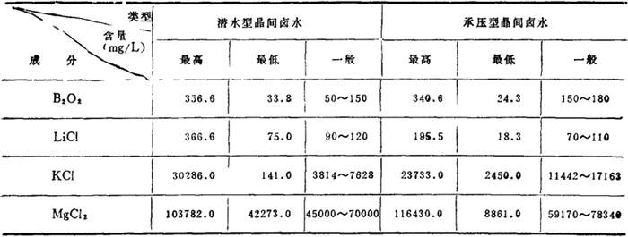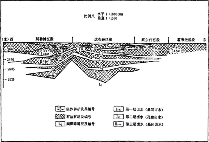 图4-1-9 察尔汗盐湖地质纵剖面示意图 表4-1-12 察尔汗盐湖晶间卤水成分(mg/L)