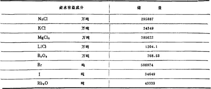 注:分析单位为中国科学院盐湖研究所。 察尔汗盐湖固体钾镁盐和石盐矿床中,主要矿物有石盐、光卤石、钾石盐、水氯镁石等,其中: 石盐矿石NaCl,储量为505.17亿吨。 钾镁盐KCl储量11313.7万吨。MgCl2储量19681.1万吨。卤水储量见表4-1-13。 表4-1-13 察尔汗盐湖卤水储量