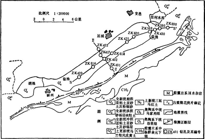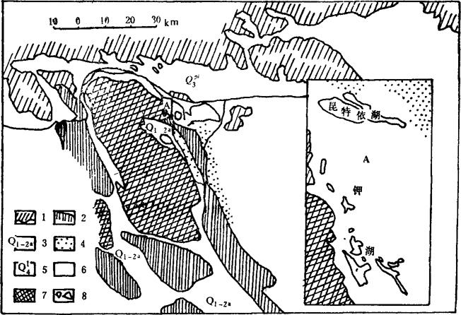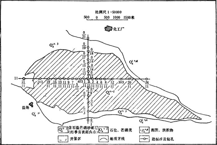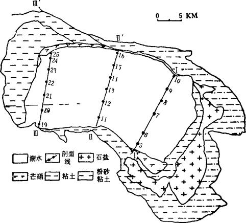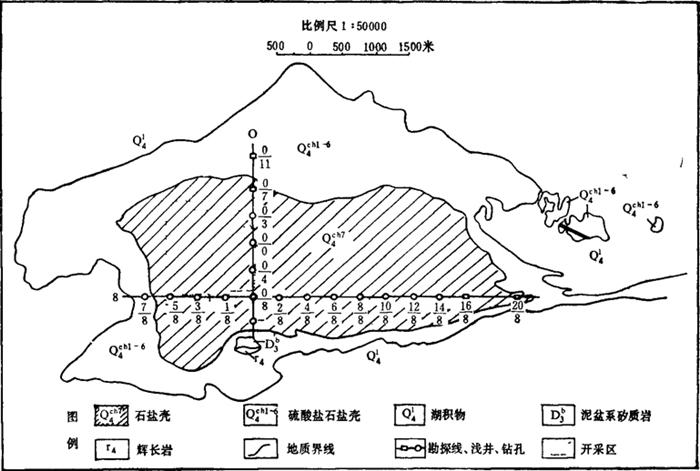 图4-1-17 运城盐湖地质略图 运城盐湖储有各种盐类8374.2万吨,其中Na2SO4 5915万吨,MgSO4 987.2万吨,NaCl 1472万吨。 湖表卤水,相对密度1.096,含MgSO4 2.29%,Na2SO4 1.5~10%,NaCl 0.6~3%。储有NaCl 24.50万吨,Na2SO4 52.10万吨,MgSO4 21.80万吨。 |