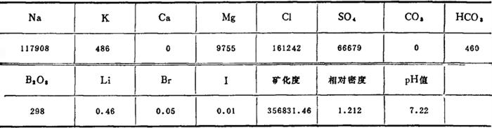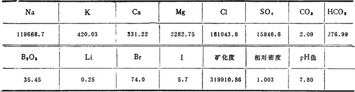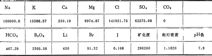 储量计算结果:石盐NaCl储量为1629.09万吨,无水芒硝矿石储量210.7万吨。浅部和深部芒硝矿石储量Na2SO4储量1609万吨。 晶间卤水,分上下两层。表层晶间卤水赋存于石盐、芒硝层中,其含水层厚度分别为0.34m和0.32m,合计0.66m;晶间卤水成分见表4-1-17,内含NaCl 256.04g/L,Na2SO4 99.50g/L。下部晶间卤水赋存于芒硝层中,厚度为0.87~1.65m,NaCl含量146.30g/L,Na2SO4 60.19g/L。 表4-1-17 七角井盐湖晶间卤水成分(mg/L)