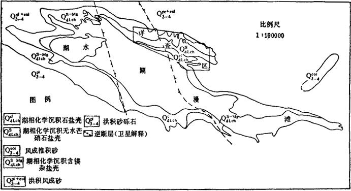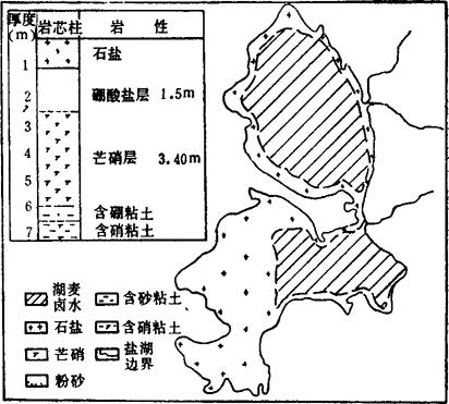 注:分析单位为中国科学院盐湖研究所。 据估算,该湖储有石盐800多万吨,芒硝近8000万吨,钾盐数十万吨,镁盐数千万吨,硼盐数百万吨,锂盐数十万吨,是个很有综合利用前景的盐湖矿床。 (十三)扎布耶茶卡 1.地理位置 位于西藏自治区仲巴县隆嘎尔区;地理座标:东经84°00′,北纬31°35′。由隆嘎尔区至湖区有便道通行。 2.盐湖类型 按M.T.瓦里亚什科分类方法,属于碳酸盐型盐湖。 3.盐湖资源 为固液并存的硼酸盐、石盐、芒硝盐湖矿床,面积250km2(图4-1-16)。据西藏地质局第一地质队钻孔揭露,石盐出露于湖表,盐质很纯,可直接开采利用;层厚1.03m,估算NaCl地质储量4000万吨;芒硝层位于石盐层之下,层厚3.40m,储量约数千万吨;湖底硼砂层分别为1.53m和0.51m,硼砂储量近500万吨。