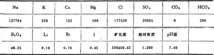 储量计算结果:石盐NaCl储量为1048.43万吨。无水芒硝Na2SO4储量4620.76万吨。 液体矿,包括湖表卤水和晶间卤水。湖表卤水受雨季影响。丰水期,湖水环绕盐类沉积区分布,其最大面积17.7km2,最大水深1.67m,平均0.46m;枯水期,湖水在湖区北侧呈条带状分布,面积3.88km2,最大水深1.2m,平均0.195m。湖表卤水成分,NaCl 253.67g/L,Na2SO4 22.82g/L,MgSO4 26.23g/L,B2O3 0.17~0.22g/L。晶间卤水分布于石盐、芒硝层中,其成分:NaCl 271.66g/L,Na2SO4 36.31g/L,MgSO4 17.38g/L,含B2O3 0.156g/L(表4-1-19)。 表4-1-19 达板城东湖卤水成分(mg/L)
