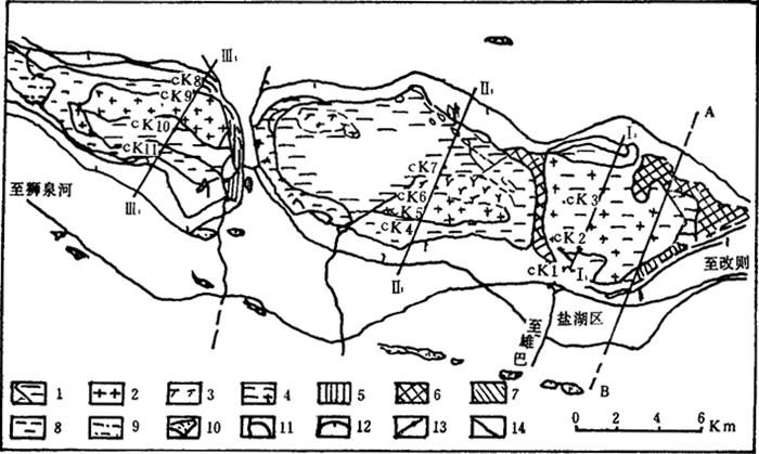 图4-1-13 艾丁湖地质示意图 晶间卤水和湖表卤水成分见表4-1-20、21。 表4-1-20 艾丁湖湖表卤水成分(mg/L)