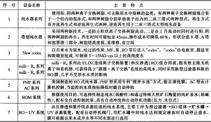 | 释义 | 主要纯水设备 饮用纯水设备一般包括反渗透装置、离子交换树脂塔、超滤装置、紫外线杀菌装置、微滤装置、电阻仪等部分,必要时还需配备真空脱气塔。水处理一节中已介绍了各种水处理设备,现将典型的饮用纯水系统列于表2-4-5中,供参考。 表2-4-5 主要纯水设备