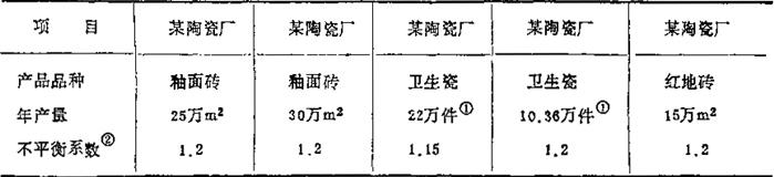 3.设计不平衡系数 设计不平衡系数——是考虑不向车间设备之间挖潜裕度差别面确定的设计参数。通常陶瓷工厂成型车间设备挖潜裕度大大低于原料车间设备,故成型车间设备不平衡系数为大于1的数值(例如:不平衡系数为1.2),此时,设备平衡计算完成后,成型车间设备设计能力=成型车间理论设备生产能力(按物料衡算与设备选型后确定的设备台数)×1.2(不平衡系数)。换言之,成型车间最终设备能力的确定,除按规定进行设备衡算外,还要相应增加20%的贮备生产能力。设计不平衡系数取值实例参见表1-88。 表1-88 陶瓷工厂设计不平衡系数实例