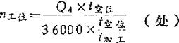 式中 Q1——产品年加工量,t或万件/年(a); P2——每窑装载量,t或万件/窑·次; t1——年工作日、一般取330d(日)/a·座; t2——每窑生产周期,d/窑次; N(间歇窑)——需用窑炉的座数,座。 6.隧道窑使用窑车数量的计算公式