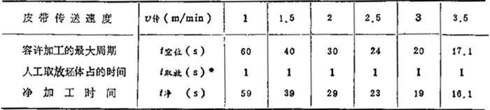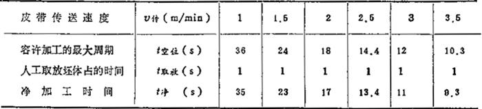 式中 n工位——同种工序应设工位数,处; t空位——皮带上取坯后空位行走最大限度距离相应时间(即每处工位从皮带面上取放并加工一件坯体的最大周期时间),s/周期; t加工——每加工一件坯体(包括人工在皮带上取放坯体的时间)实际需要的时间,s/件; 3600——每小时含秒数,s/h; Q4——流水作业线首道工序每小时的产量,件/h; t空位/t加工——每处工位每一取放坯体的最大周期时间内可加工的坯件数,件/处·周期。 上式中t空位系根据空位行走最大限度距离及正常皮带传送速度所确定的时间,参见表1-89及表1-90中的相关参数。表中t空位可按下式计算: 表1-89 产品空位行走限定距离0.6m的相关参数表