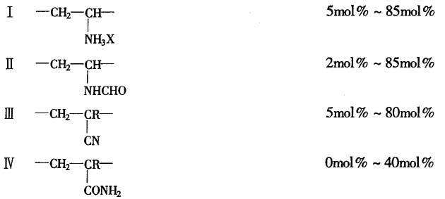 | 释义 | 乙烯胺共聚物及其用于废水处理的凝集剂 本文中介绍的乙烯胺共聚物,在废水处理时作凝集剂使用时具有优良的效果,特别是用于有机污泥脱水用凝集剂时,能使脱水污泥的含水率下降,明显地提高处理效率。 聚乙烯胺传统的制造方法是将聚乙烯酰胺水解。这种聚乙烯基甲酰胺均聚物水解法,可合成高分子量的稳定性良好的聚乙烯胺。然而,这样得到的聚合物,亲水性极高,作为脱水用凝集剂使用时效果不佳。 为了使聚乙烯胺具有疏水性,传统的方法是预先将N-乙烯基甲酰胺与乙烯共聚,然后再进行水解。但是N-乙烯基甲酰胺与乙烯的共聚性不良,难以得到高分子材料,故此法也未被采用。 以前,还有把N-乙烯基羧酸酰胺与丙烯腈共聚后水解,将腈基的10mol%以上水解为羧酸而得凝集剂的。以后有将N-乙烯甲酰胺和(甲基)丙烯腈共聚物的碱性水解物作凝集剂的。 本凝集剂是将乙烯基甲酰胺在酸性条件下改性,成为疏水性的高分子量乙烯胺共聚物。本凝集剂含有以下结构: