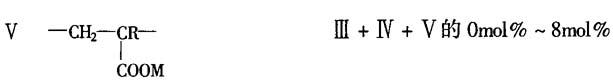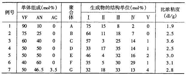 本品为水溶性聚合物,其比浓粘度为0.1~10dl/g,最好为1~10dl/g。 例1~9 在设有搅拌器、氮气入口、冷凝管的50ml四口烧瓶中,装入含下表所列的摩尔百分率的单体混合物4g的水溶液35.9g,在氮气氛中搅拌,升温到60℃后,添加10%的2,2′-偶氮-2-戊二酮丙烷-二盐酸盐的水溶液0.12g。再在搅拌中保持60℃3小时,于此水溶液中析出聚合物而成为悬浮体。用液相色谱测定水中残存的单体,从而计算出聚合物的组成。再以相对于聚合物的甲酰基添加浓盐酸,在75℃下搅拌8小时,并将此聚合物水解。 把所得的聚合物溶解添加在丙酮中,析出的聚合物置于真空中干燥,得固态的聚合物。生成物的结构单位及比浓粘度列于表1。 表1 乙烯胺共聚单体的组成及聚合反应结果