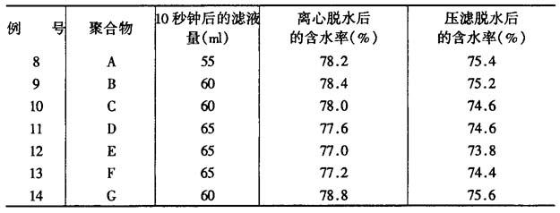 注:VF为N-乙烯基甲酰胺;AN为丙烯腈;AC为丙烯酸钠。 例8~14 将某市下水处理混合生污泥(固体份为2.0%)100mol,放入200mol的聚乙烯烧杯中,再添加表2的聚合物(A~G)0.2%的水溶液。用附有三根直径为5mm、长为20mm的圆柱的搅拌器,以1000r/min的速度搅拌10秒钟。再使用将凝集后的污泥放在直径为65mm的60目尼龙筛为底的圆筒中,以重力进行过滤,10秒钟后测定滤液的重量(测定结果列于表2)。取一部分以重力过滤后的污泥,在沥去水分后,放入有网的离心机中,以3000r/min的高速离心脱水。脱水后的污泥在110℃下干燥6小时,再测定其固体份。由离心脱水后的产品的污泥的含水率列于表2。此后,再用压滤法采用类似操作方法计算出其含水率,其结果也列于表2。 表2 凝集剂效果的测定