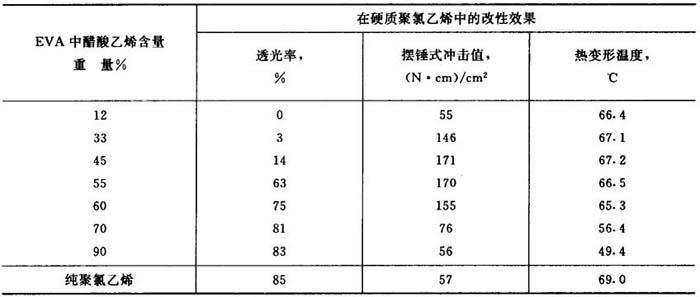 | 释义 | 乙烯-醋酸乙烯共聚物,EVA树脂 【释文】: 用途 本品由乙烯和醋酸乙烯共聚而得。白色粉末,可作为聚氯乙烯的抗冲击剂,其效果随共聚体中醋酸乙烯的含量而异。醋酸乙烯的含量低时,与聚氯乙烯的相容性差,增强效果低,制品不透明,随着醋酸乙烯含量的增高,共聚体与聚氯乙烯的相容性变好,增强效果提高,制品透明性也较好。但醋酸乙烯的含量过高也不好,一般为30~60%。表16-1列出了在EVA树脂中醋酸乙烯的含量与对硬质聚氯乙烯改性效果的关系。 表16-1EVA树脂中醋酸乙烯的含量与改性效果的关系