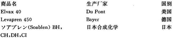 配方:聚氯乙烯(平均聚合度P=800) 100份 EVA树脂 10份 T.V.S.#N-200E(有机锡热稳定剂) 2份 T.V.S.#3-I.P(有机锡热稳定剂) 2份 液体石蜡 0.2份 混炼温度175℃ 单独使用EVA树脂作抗冲击剂有许多缺点:由于EVA树脂与聚氯乙烯相容而且在聚氯乙烯加工温度下熔融,所以制品的抗张强度小,热变形温度低,耐化学性也较差;EVA树脂与聚氯乙烯的折光率不同,不能制得透明制品;再者,EVA树脂在聚氯乙烯中的分散状态受温度等捏炼条件影响很大,限制了加工条件的变化幅度。因此,实际作用的多是EVA树脂改性品种,或将其与其它树脂并用。近年来EVA系抗冲击剂的发展呈下降趋势,而丙烯酸酯类抗冲击剂发展迅速。 国内生产厂 上海化工研究院 北京有机化工厂 北京化工研究院 国外生产厂