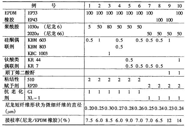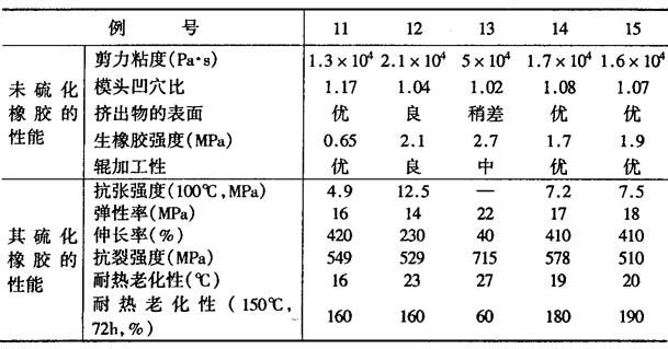 例11 将例1所制得的强化橡胶65.1份、EP22(EPDM橡胶)40份、HAF(炭黑)50份、萘系操作油25份、氧化锌5份和硬脂酸1份,在捏合机中混炼5分钟。混炼开始时捏合机的温度为60℃,辊旋转数为75r/min,从而得混炼物。再将上制的混炼物(以其中的橡胶成分计)100份、硫化促进剂TS1.5份、硫化促进剂M0.5份和硫1.5份用254mm直径的辊混炼,得未硫化橡胶。其硫化橡胶的硫化温度和时间为:80℃×60min~160℃×30min。 例12 以例2所得的强化橡胶61.6份代替例1的强化橡胶,EP22的用量改为60份,其他同例11,制备未硫化橡胶并对其硫化橡胶的性能进行测试。 例13 以例3所得的强化橡胶185份代替例1的强化橡胶,不加EP22型EPDM橡胶,其他均同例11,制备未硫化橡胶,并对其硫化橡胶的性能进行测试。 例14 以例7所得的强化橡胶30.8份,代替例1的强化橡胶;EP22型EPDM橡胶80份;其他均同例11,制备未硫化橡胶,并对其硫化橡胶的性能进行测试。 例15 以例9所得的强化橡胶31份代替例1的强化橡胶;EP22型EPDM橡胶80份,其他均同例11,制备未硫化橡胶,并对其硫化橡胶的性能进行测试。 表2 未硫化橡胶和其硫化橡胶的性能
