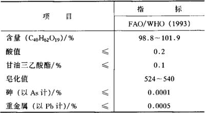 使用范围及使用量 我国《食品添加剂使用卫生标准》(GB 2760-1996)规定:可用于乳化香精,最大使用量为70g/kg(相当于碳酸饮料中含0.14g/kg)。