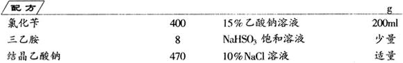 100ml三颈烧瓶中加搅拌、测温、回流脱水装置,加入400g氯化苄、8g三乙胺,于100℃反应0.5h,形成季铵盐,稍冷后加入470g结晶乙酸钠,回流脱水,直至无水脱出为止(约1h)。然后回流3h,蒸出三乙胺,冷后加入200ml 15%乙酸钠溶液,加热回流,水解后直到有机相检不出氯化苄为止(铜网检测法),粗品用少量饱和的NaHSO3水溶液洗涤,然后用10% NaCl水溶液洗涤,有机相加1g硼酸进行减压蒸馏,即得成品,收率可达86%。