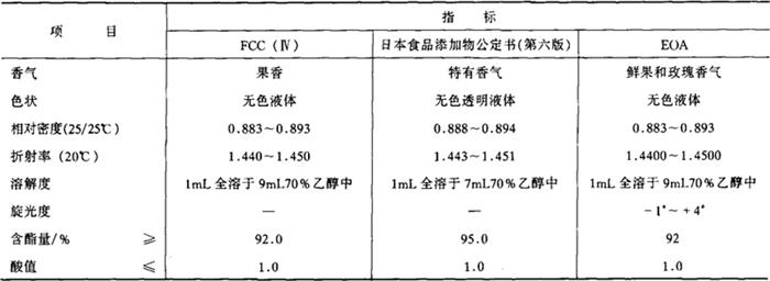 C12H22O2 相对分子质量 198.31 性状 无色液体,沸点240℃(119~121℃/ 1999.5Pa)。具有近似于玫瑰香的清鲜的水果香气,开始时具辛辣的味道,以后转成甜的、杏子样的味道。溶于大多数有机溶剂。 制法 由天然的或合成的香茅醇直接乙酰化而制得。其物理化学性质受所用原料醇的质量影响极大。 质量标准