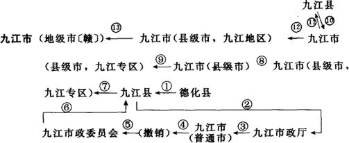 ①1912年称德化县;1914年因与福建、四川等省德化重名,改称九江县。②1927年3月在城区设九江市政厅。③1928年改称九江市(普通市)。④1930年撤销九江市。⑤1934年6月设九江市政委员会。⑥1936年裁九江市政委员会,并入九江县。⑦1949年析九江县城区及近郊区置九江市(县级市),隶九江专区。⑧1954年九江市(县级市),由省直辖。⑨1958年九江市(县级市)隶九江专区。⑩1959年1月撤销九江县,并入九江市。⑾1961年恢复九江县。⑿1970年九江专区改为九江地区,九江市属之。⒀1983年7月九江市升格为地级市。撤销九江地区,原九江地区辖的九江县、彭泽县、湖口县、都昌县、星子县、永修县、德安县、瑞昌县、武宁县、修水县改由九江市(地级市)辖,实行市管县体制。