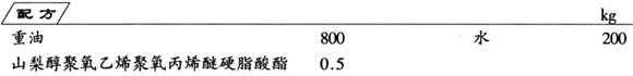 先将水与山梨醇聚氧乙烯聚氧丙烯醚硬脂酸酯混合均匀,再将其加入重油中,边加边搅拌,使其充分混合均匀,即成乳化重油。本配方引自日本公开特许7812906。