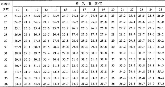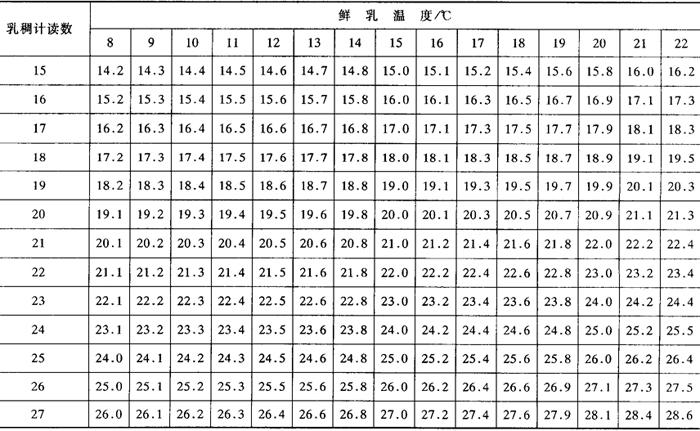 表4-2-27 乳稠计读数变为温度15℃时的度数换算表