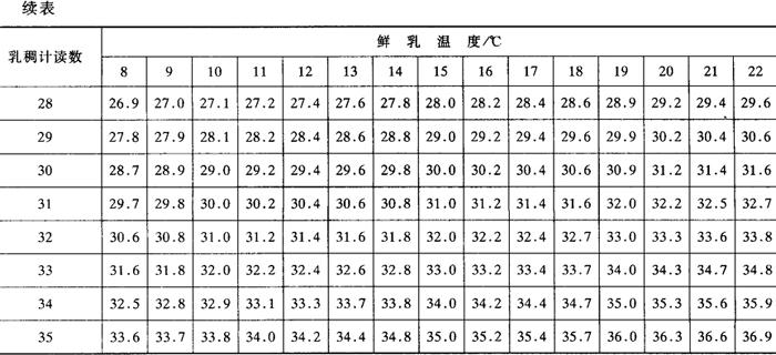 表4-2-28 乳稠计读数变为20℃时的度数的换算表
