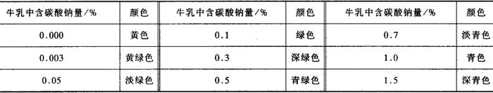 (2)滴定酸度:用0.1mol/L氢氧化钠滴定法,滴定100mL乳所耗用的0.1mol/L氢氧化钠毫升数称为滴定酸度。用°T表示。 测定方法:吸取10mL牛乳置于100mL三角瓶中,加入20mL蒸馏水,再加入0.5mL0.5%的酚酞乙醇溶液,搅拌均匀,将0.1mol/L氢氧化钠标准溶液于5mL的微量滴定管滴定至微红色,在1min内不消失为止。消耗0.1mol/L氢氧化钠标准溶液的毫升数乘以10即为酸度(°T)。 (3)说明: ①淡炼乳:吸取10.0mL样品液,加60mL新煮沸放冷的水及数滴酚酞指示剂,以下自“搅拌均匀”后操作。 ②甜炼乳:称取10.00g样品,加65mL新煮沸放冷的水,以下自“搅拌均匀”后操作。 ③奶油:准确称取10g样品,加30mL中性乙醇-乙醚混合液,混匀,并加入数滴酚酞,以下自“搅拌均匀”后操作。 4.牛乳的加碱测定 为了掩盖牛乳的酸败作用,防止牛乳因变酸而发生凝结现象,而在牛乳中加碱(Na2CO3或NaHCO3),从而使牛乳滋味不佳,易腐败,对人体健康不利。 (1)试剂:0.04%溴麝香草酚蓝乙醇溶液。 (2)操作方法:把5mL被检牛乳注入试管中,将试管保持倾斜位置,再沿管壁小心加入溴麝香草酚蓝溶液5滴,把试管小心斜转2~3次(勿使两液混合),然后把试管垂直放置,2min后根据指示剂环层和颜色特征确定结果,同时做空白对照试验(见表4-2-30)。 表4-2-30 牛乳中碳酸钠量与指示剂颜色
