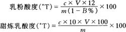 式中 x——样品中总固体的含量(g/100g); m0——皿和海沙质量(g); m1——皿和海沙加样品干燥后质量(g); m——皿和海沙加样品质量(g)。 而: 样品中非脂固体含量(g/100g)=样品中总固体含量-样品中脂肪含量 (四)乳制品理化检验 1.乳粉的水分测定 参见第二章第一节。 2.酸度的测定 称取样品4g(准确至0.01g),置于50mL烧杯中,用煮沸过的蒸馏水(除去CO2)70~90mL分数次将样品溶解,洗入250mL三角瓶中,加热至80℃,静置冷却,加数滴酚酞溶液,摇匀,用0.1mol/L氢氧化钠滴定至微红色,1min内不消失。 计算: