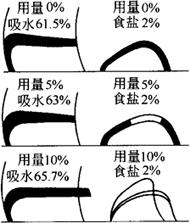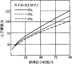 图1-2-1 脱脂乳粉对面团的影响 3.提高了面团筋力和搅拌能力 乳制品中含有大量乳蛋白质对面筋具有一定的增强作用,提高了面团筋力和面团的强度,不会因搅拌时间延长而导致搅拌过度。特别是对于低筋面粉更有利。加入乳粉的面团更能适合于高速搅拌,改善面包的组织和体积。 4.提高面团的发酵耐力 乳制品可以提高面团发酵耐力,不至于因发酵时间延长而成为发酵过度的老面团,是因为在乳制品中含有的大量蛋白质,对面团发酵过程中pH的变化具有一定缓冲作用,使面团的pH不会发生太大的变化,保证面团的正常发酵。乳制品还可抑制淀粉酶的活性。减缓酵母的生长繁殖速度,使面团发酵速度适当放慢,有利于面团均匀膨胀,增大面包体积。另外,乳制品可刺激酵母内酒精酶的活性,提高了糖的利用率,有利于二氧化碳气体的产生。 5.改善制品的组织 由于乳制品提高了面团筋力,改善了面团发酵耐力和持气性,因此,含有乳品的制品组织均匀、柔软、酥松,并富有弹性。 6.延缓制品的老化 乳中蛋白质及乳糖、矿物质等有抗老化作用。乳制品中含有大量蛋白质,使面团吸水率增加,面筋性能得到改善,面包体积增大,这些因素都有助于使制品老化速度减慢,提高其保鲜期。见图1-2-2。